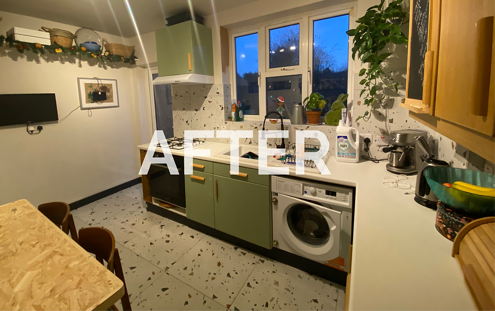 This was a sustainable friendly complete new look; the old kitchen cabinetry stayed in situ, while I sanded, repainted and attached new handles to the doors, installed new integrated appliances, a new worktop, sink and ripped out the old lino flooring replacing it with these large terrazzo tiles